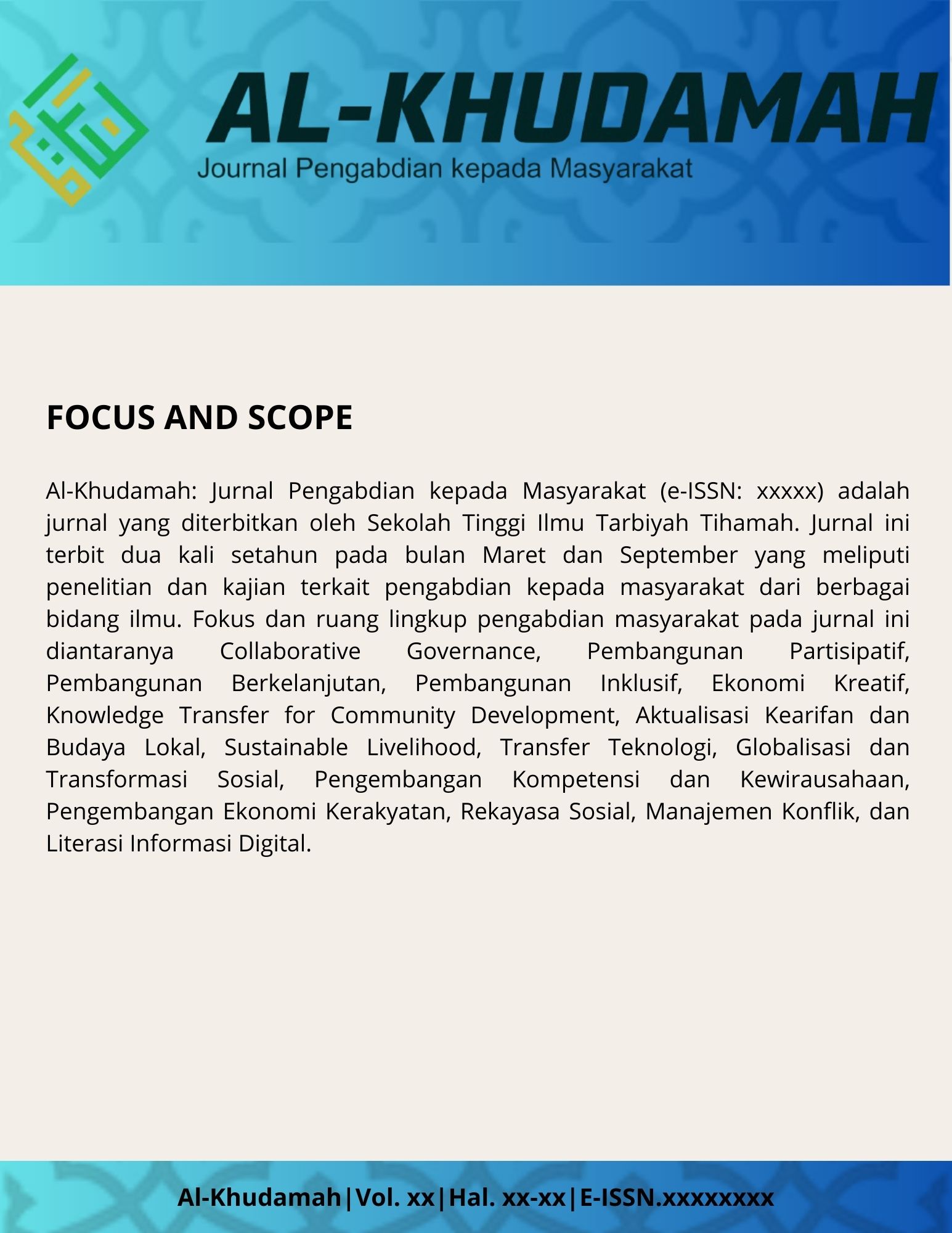 Al-Khudamah: Jurnal Pengabdian kepada Masyarakat (e-ISSN: xxxxx) adalah jurnal yang diterbitkan oleh Sekolah Tinggi Ilmu Tarbiyah Tihamah. Jurnal ini terbit dua kali setahun pada bulan Maret dan September yang meliputi penelitian dan kajian terkait pengabdian kepada masyarakat dari berbagai bidang ilmu. Fokus dan ruang lingkup pengabdian masyarakat pada jurnal ini diantaranya Collaborative Governance, Pembangunan Partisipatif, Pembangunan Berkelanjutan, Pembangunan Inklusif, Ekonomi Kreatif, Knowledge Transfer for Community Development, Aktualisasi Kearifan dan Budaya Lokal, Sustainable Livelihood, Transfer Teknologi, Globalisasi dan Transformasi Sosial, Pengembangan Kompetensi dan Kewirausahaan, Pengembangan Ekonomi Kerakyatan, Rekayasa Sosial, Manajemen Konflik, dan Literasi Informasi Digital.